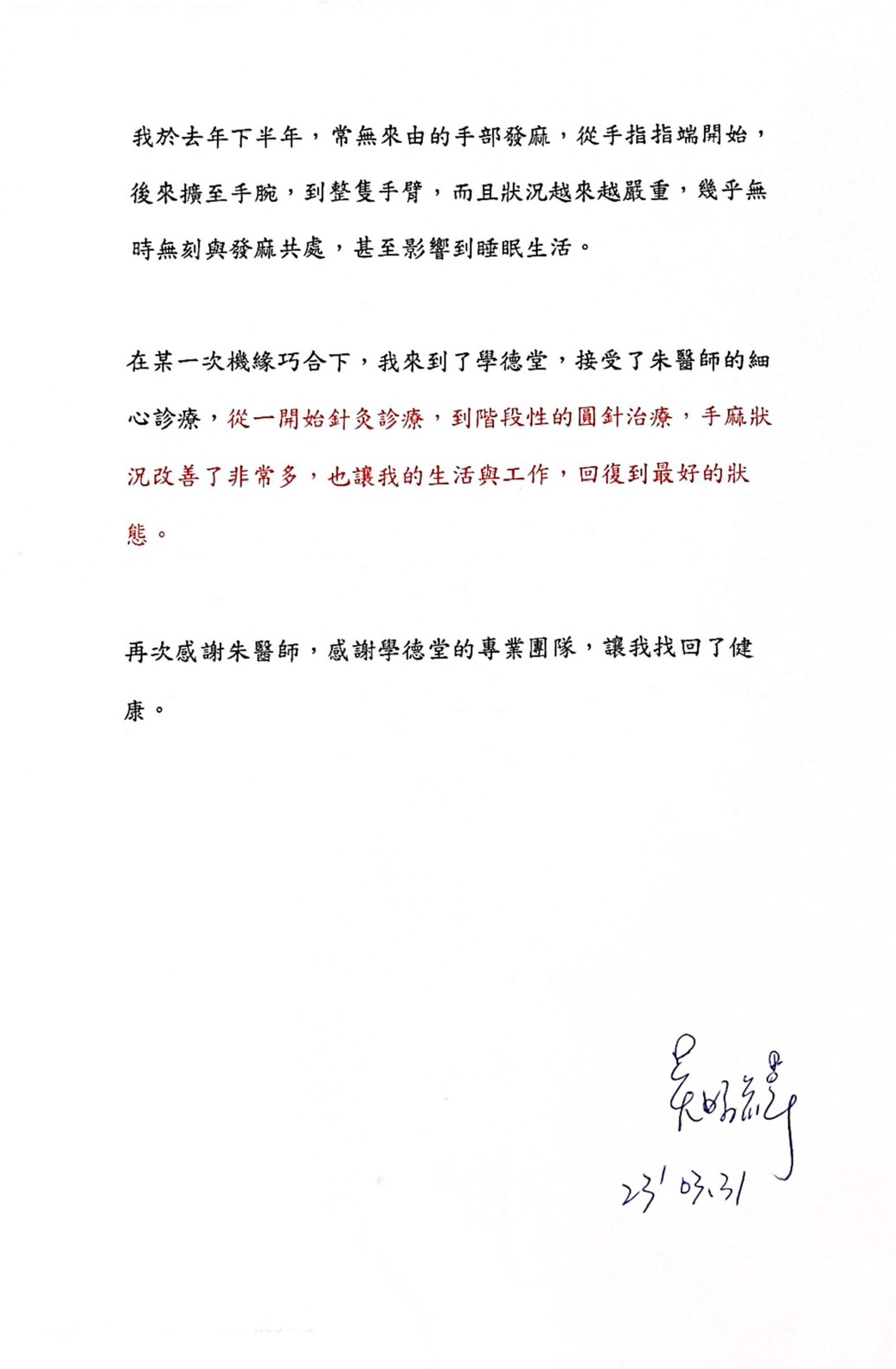 在第一次圓針治療後,睡眠品質就改善,再經過幾次圓針後肩頸放鬆、手麻的頻率下降、麻感亦降低,改善非常多,也讓生活與工作,