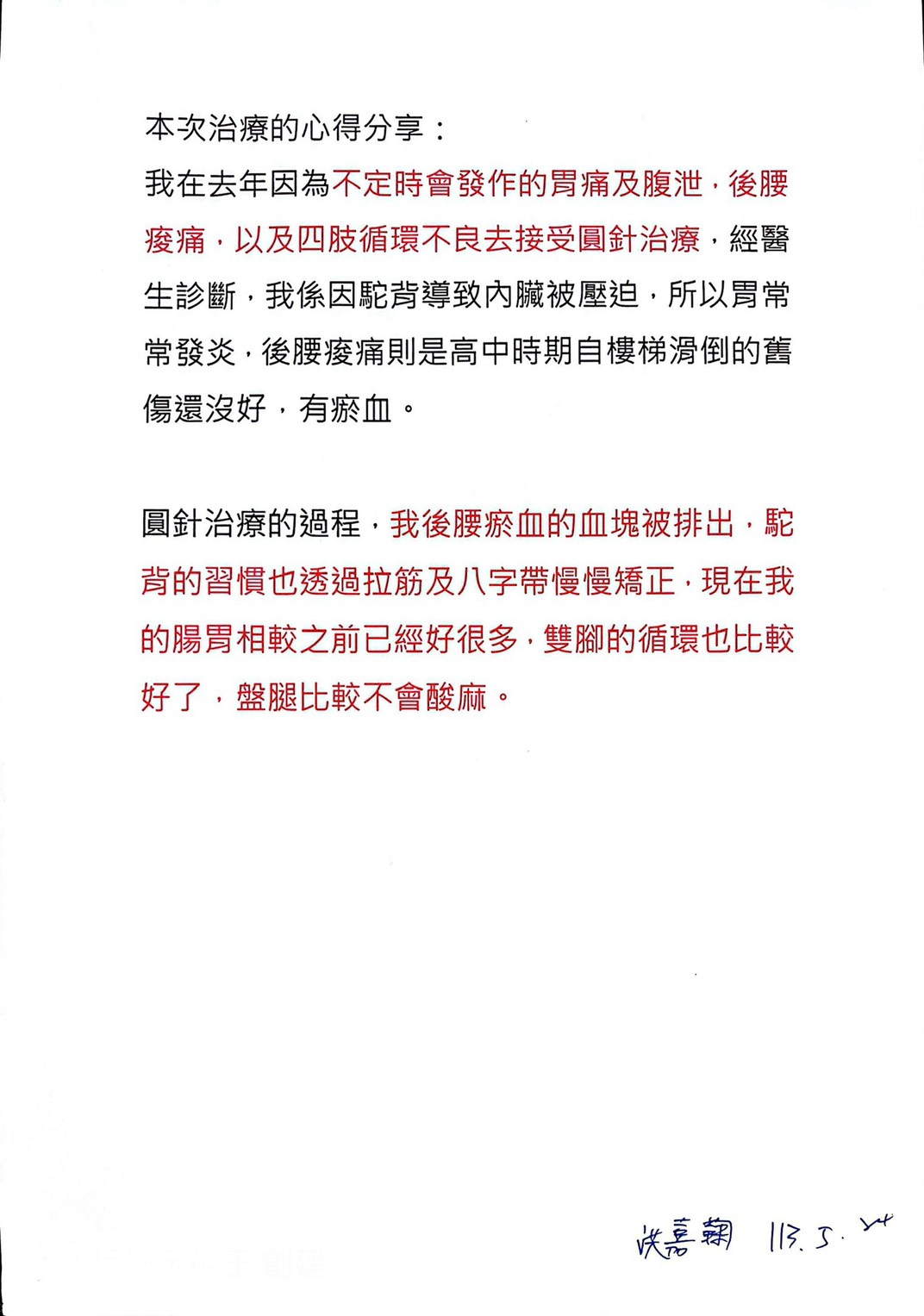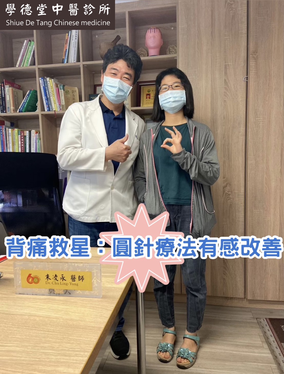 透過圓針治療,把腰部肌肉層的瘀血、血塊排出,駝背的習慣也透過治療之後的拉筋及八字帶慢慢矯正,