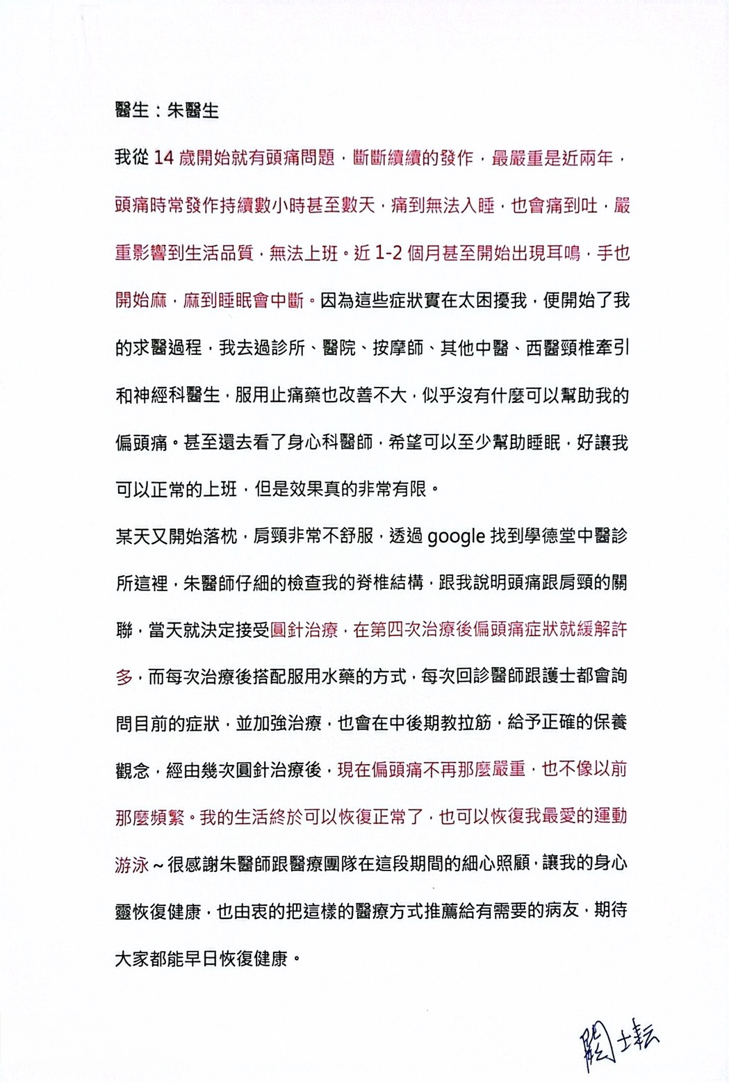 士耘由衷感謝學德堂中醫診所醫師與護理團隊的專業照護與細心陪伴,讓長期困擾的症狀獲得實質改善,重拾正常生活品質。